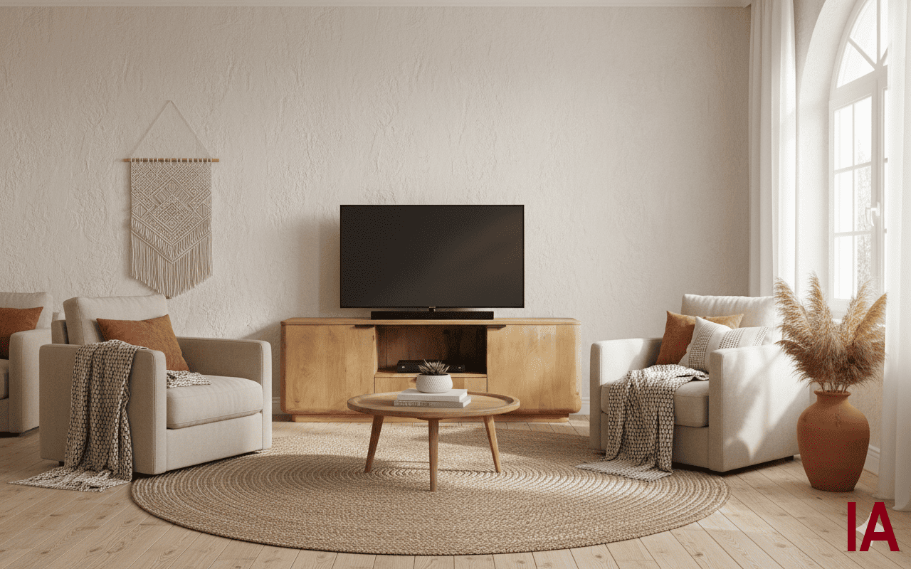 Mueble de TV fabricado en madera de mango en color natural, con diseño de líneas limpias y esquinas redondeadas que aportan suavidad al conjunto. Cuenta con dos puertas laterales, un cajón central inferior y un hueco abierto en la parte superior, ideal para dispositivos electrónicos. Los tiradores metálicos añaden un toque moderno y funcional, contrastando sutilmente con la calidez de la madera.