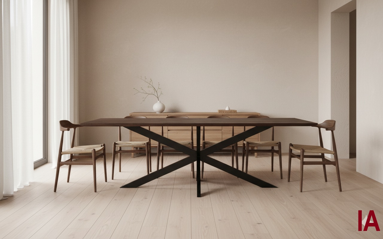 Mesa de Comedor fabricada en madera de acacia, un material resistente y de alta calidad, con un acabado en color nogal que resalta la belleza natural de la veta de la madera. Cuenta con una moldura en el canto, aportando un detalle elegante y refinado. La base está construida en hierro, proporcionando gran estabilidad y durabilidad. Su diseño de araña, con patas cruzadas, crea un estilo moderno e industrial. El acabado en negro mate da un contraste sofisticado con la madera y un toque contemporáneo. Esta mesa es una combinación perfecta entre lo cálido de la madera y la solidez del metal, ideal para ambientes modernos, industriales o rústicos elegantes.