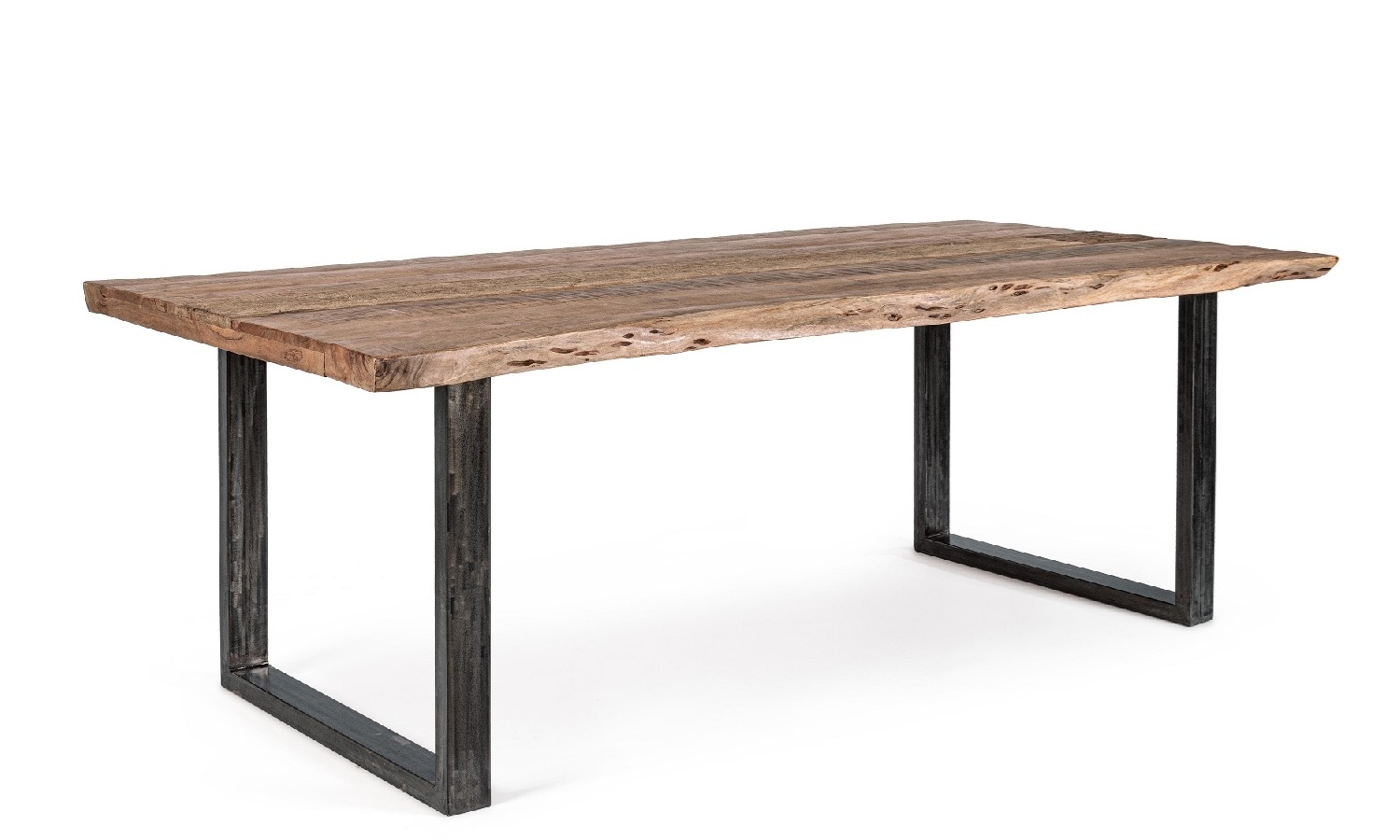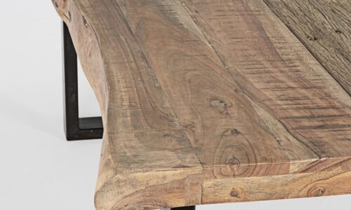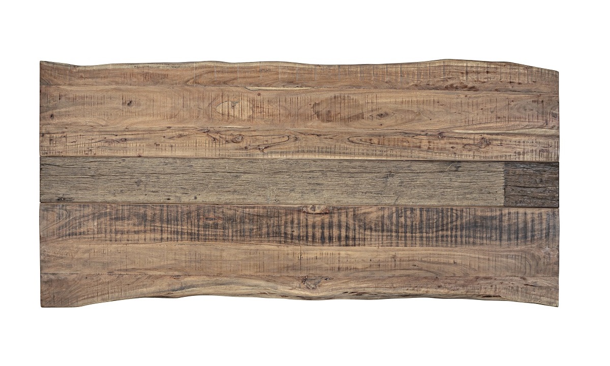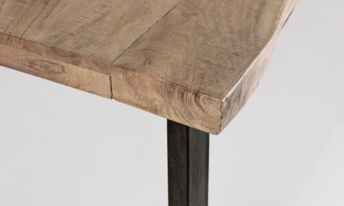 Tapa de madera maciza de acacia, elaborada a partir de secciones originales de troncos, lo que asegura que cada mesa sea única e irrepetible.
