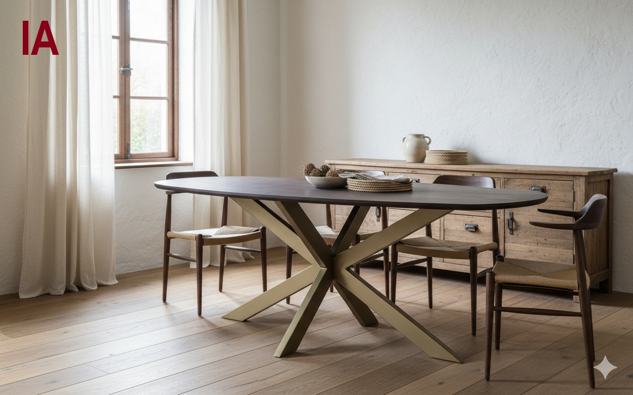 Esta mesa de comedor ovalada destaca por su diseño sofisticado y materiales de alta calidad. Su tapa, fabricada en madera de acacia, exhibe una textura rica y natural, realzada por un elegante acabado en color nogal que aporta profundidad y calidez al conjunto. El contorno de la tapa cuenta con un bisel como moldura. Las patas, de hierro lacado en dorado mate, están diseñadas en un estilizado formato de araña, proporcionando una base firme y visualmente impactante. Esta mesa no solo es funcional y resistente, sino que también se convierte en una pieza central de gran presencia y sofisticación para cualquier comedor.
