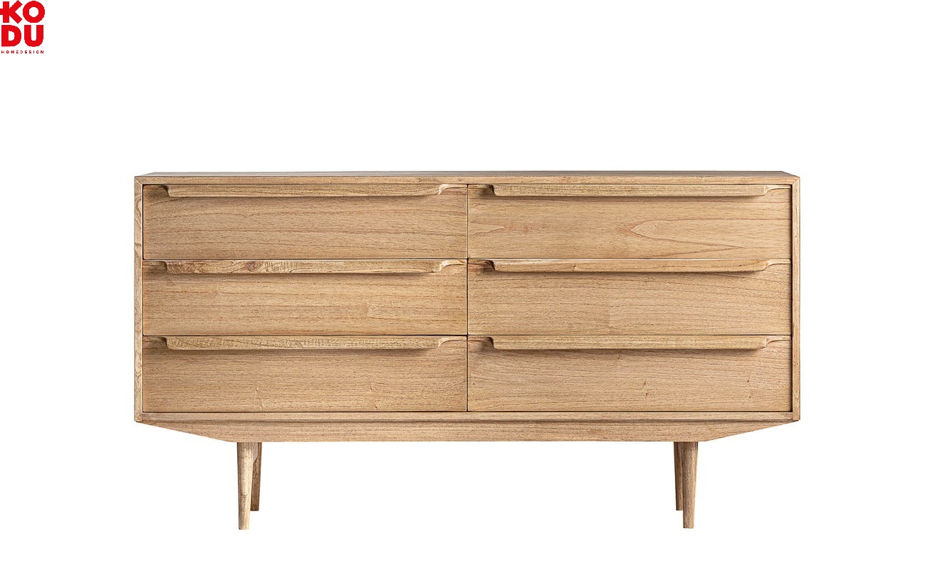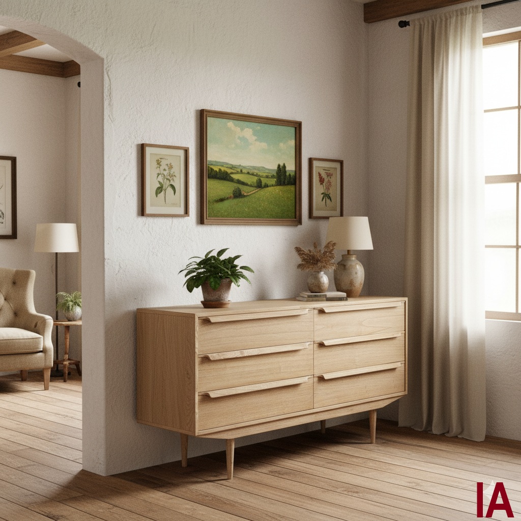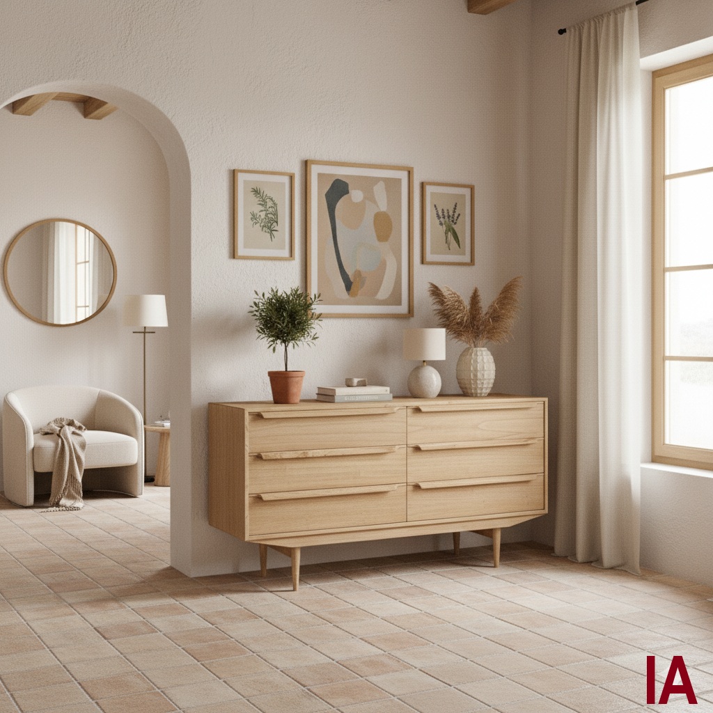 Porque es la solución total para dormitorio, vestidor o salón. Sus 150 cm de ancho ofrecen una superficie superior perfecta para decoración, y sus seis cajones resuelven cualquier problema de espacio. ¡La calidad de la madera maciza y el diseño nórdico jamás han sido tan accesibles!