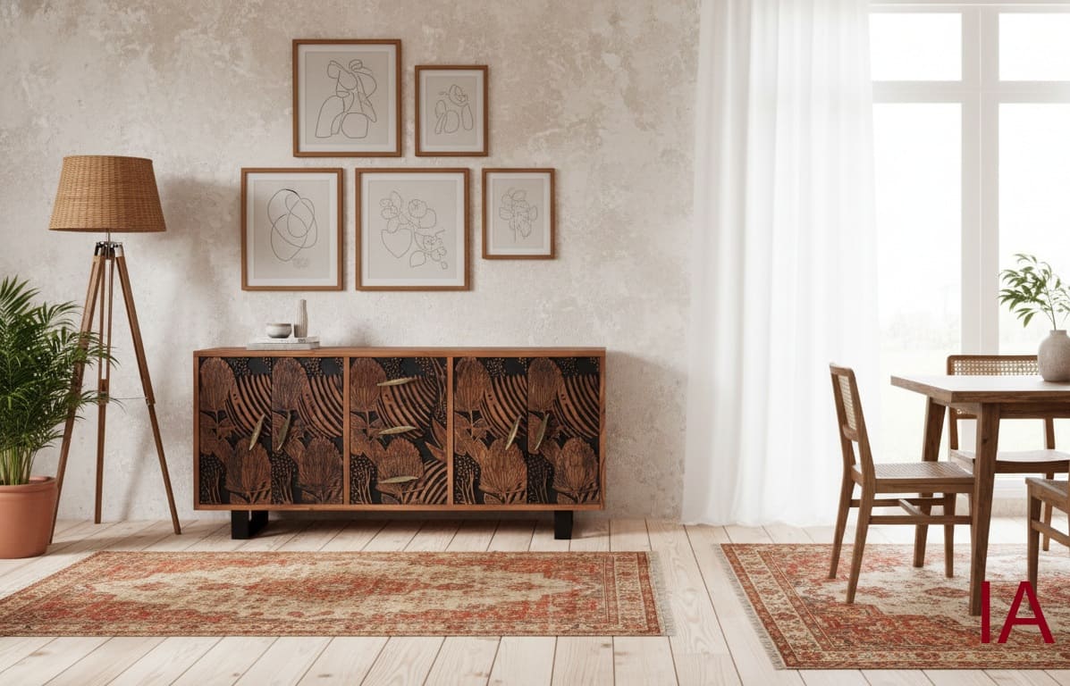 ¿Tu salón es invisible? 🤯 Es hora de un golpe de DISEÑO MONUMENTAL, LUJO ORGÁNICO Y CARÁCTER INDOMABLE! El APARADOR OMNI no es un mueble; es un LIENZO ESCULTÓRICO de acacia maciza. Su frontal tallado con un patrón floral exótico es una ILUSIÓN VISUAL que no tiene rival. Si buscas una pieza agresiva, funcional y que grite exclusividad, ¡DEBES ADQUIRIR ESTA OBRA DE ARTE AHORA MISMO!