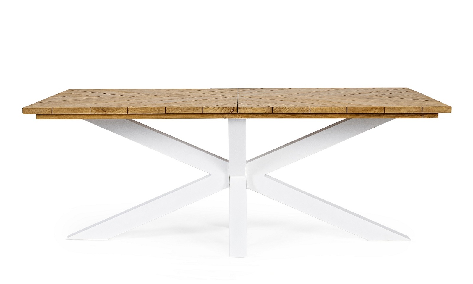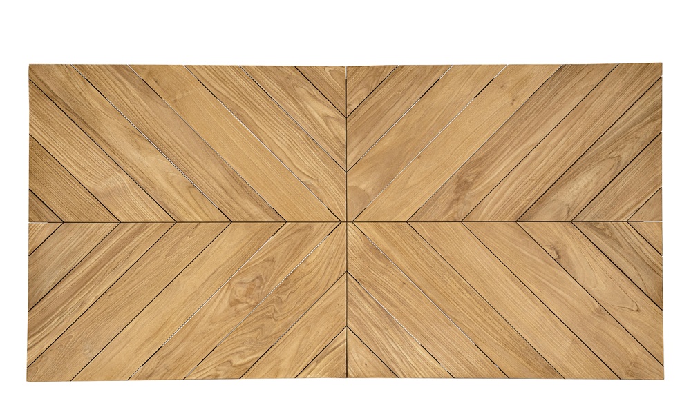 Su tapa de listones de madera de teca clase A certificada SVLK, confeccionada con un patrón geométrico único, convierte la superficie en una obra de arte natural, destacando la nobleza de la teca y aportando un aire contemporáneo y exclusivo.