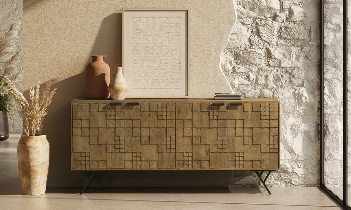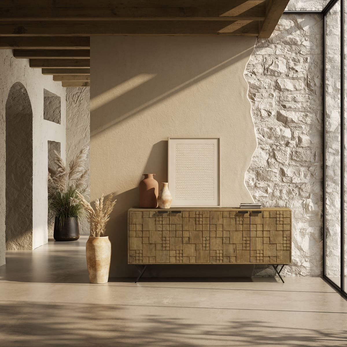 Convierte tu hogar en un espacio con estilo gracias al aparador «PRIYA», una pieza de diseño contemporáneo y artesanal que combina funcionalidad y estética a la perfección.
