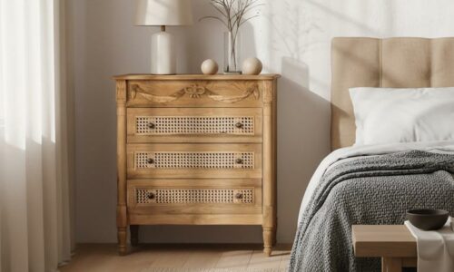 - 3 CAJONES CON REJILLA DE RATÁN TRENZADO: 🌿 La tendencia más codiciada. Los frentes de rejilla aportan una textura visual exquisita, ligereza y un toque colonial irresistible.