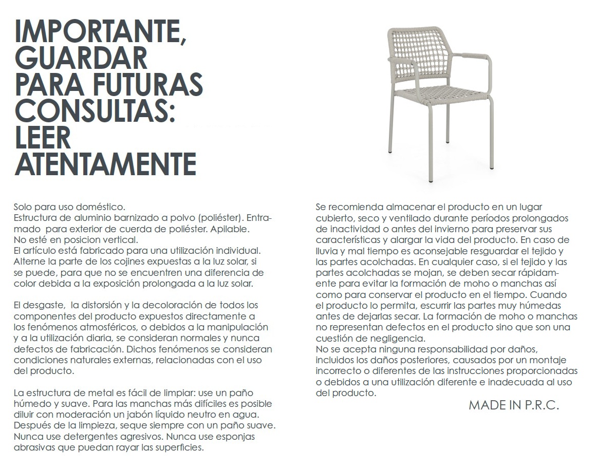 Porque es más que una silla: es comodidad, diseño y resistencia en una sola pieza. Su estructura de aluminio y su entramado de cuerda la convierten en una aliada de larga duración para tus reuniones al aire libre.
