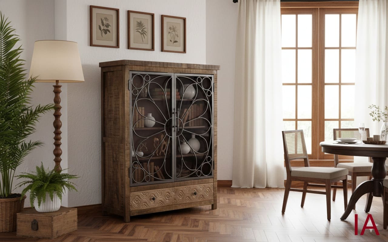La colección Rani mezcla los detalles la madera maciza de mango rough marcada a golpe de sierra y las puertas metálicas acristaladas y con enrejado de tipo industrial. Otro detalle como las fronteras de cajón talladas artesanalmente completan este bonito aparador con esa esencia vintage/colonial.