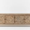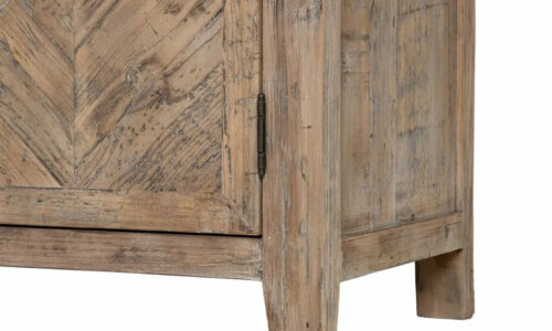 FRONTIS DE IMPACTO VISUAL: 🎨 ¡MARQUETERÍA ARTESANAL! Sus cuatro puertas presentan un diseño de listones dispuestos en espiga o diamante, creando un patrón visual dinámico y sofisticado que resalta la belleza de la madera recuperada.