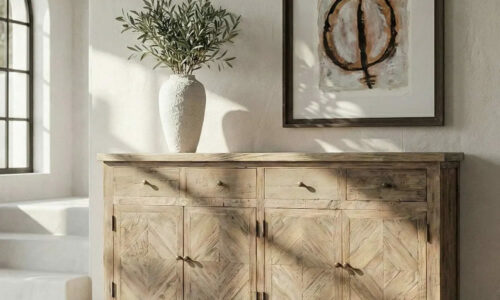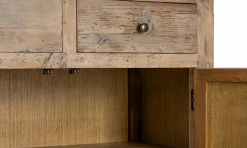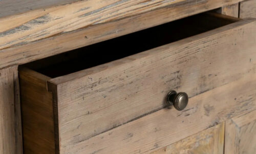 ACABADO ENVEJECIDO PREMIUM: 🐚 Su tratamiento desgastado resalta la textura orgánica, los nudos y las marcas naturales de la madera, convirtiendo cada aparador en una pieza única e irrepetible.