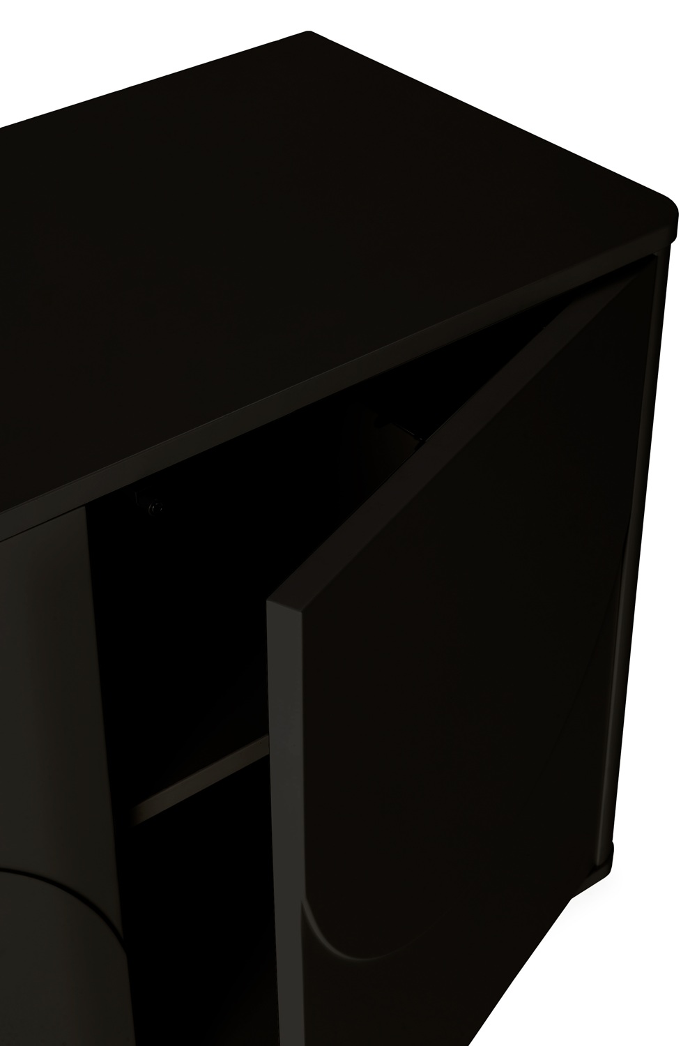Esto es MDF lacado en un NEGRO PROFUNDO, monocromático, sobre tablero melamínico, un acabado de élite que absorbe la luz y proyecta una sofisticación inigualable. Su característica más audaz es el DISEÑO ICÓNICO: cuatro puertas con una figura geométrica semiesférica grabada que se unen para formar un patrón ondulado, sutil y magnético. ¡Es puro drama visual! 😍