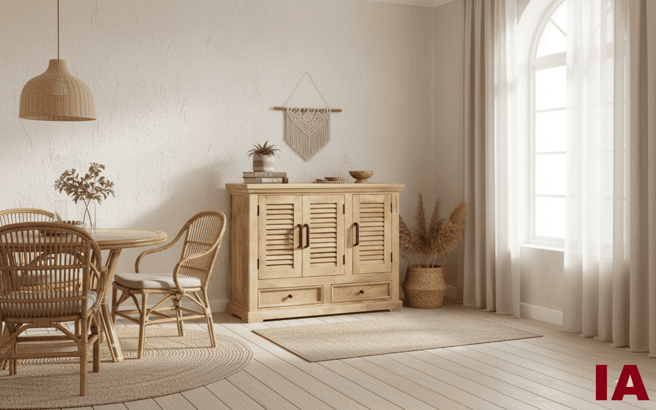 Aparador fabricado en madera de mango y acabado en tono natural, destaca por su diseño robusto que aporta calidez y carácter a cualquier espacio. Su estructura se realza con una gran moldura en la tapa, el frente está compuesto por tres puertas de estilo mallorquín, caracterizadas por sus lamas horizontales. Tras ellas, baldas amplias ofrecen un espacio de almacenaje práctico y bien distribuido, dos cajones situados bajo las puertas permiten guardar objetos más pequeños, los tiradores de hierro en color negro añaden un contraste sobrio y artesanal. El conjunto descansa sobre un zócalo que aporta solidez, estabilidad y una base visualmente equilibrada.