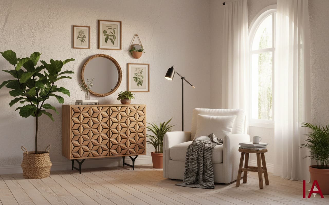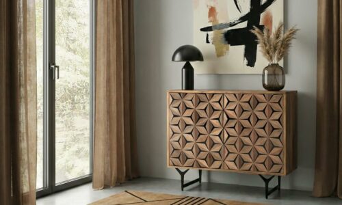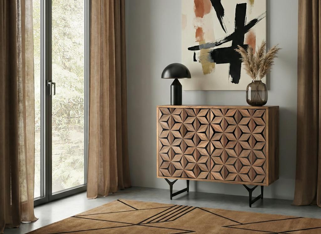 APARADOR STING (90 CM): MADERA DE MANGO MACIZA, GEOMETRÍA 3D Y DISEÑO DE VANGUARDIA. ¡LA OBRA MAESTRA COMPACTA QUE TU SALÓN NECESITA! 🌳🦾✨