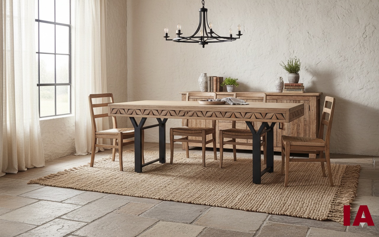 Mesa de comedor rectangular que combina elegancia rústica con un toque industrial moderno. La tapa está elaborada con madera de mango y su acabado en color natural resalta las texturas de la madera.A lo largo de los costados de la tapa, se encuentran detalles decorativos en forma de figuras geométricas de madera en relieve. La base de la mesa está formada por dos lados de hierro con un diseño en forma de «Y» que le otorga a la mesa diseño y estabilidad. Esta mesa es perfecta para reuniones familiares o cenas con amigos.