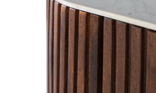 - ESTRUCTURA CURVA CON LISTONES VERTICALES: 📐 ¡DISEÑO FLUIDO! La estructura de madera de mango en NOGAL OSCURO presenta laterales curvos que suavizan las líneas. Tanto el frente como los costados curvos están adornados con LISTONES VERTICALES que añaden textura, dinamismo y un aire Art Deco.