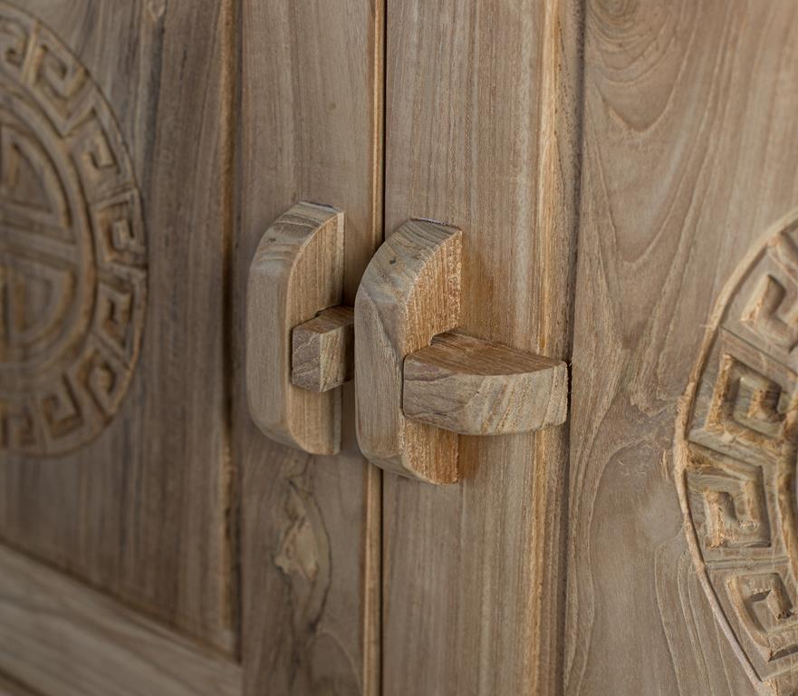 CIERRES Y BISAGRAS ARTESANALES: Los cierres tradicionales de madera y los detalles en los laterales refuerzan la autenticidad y el exquisito trabajo artesanal.