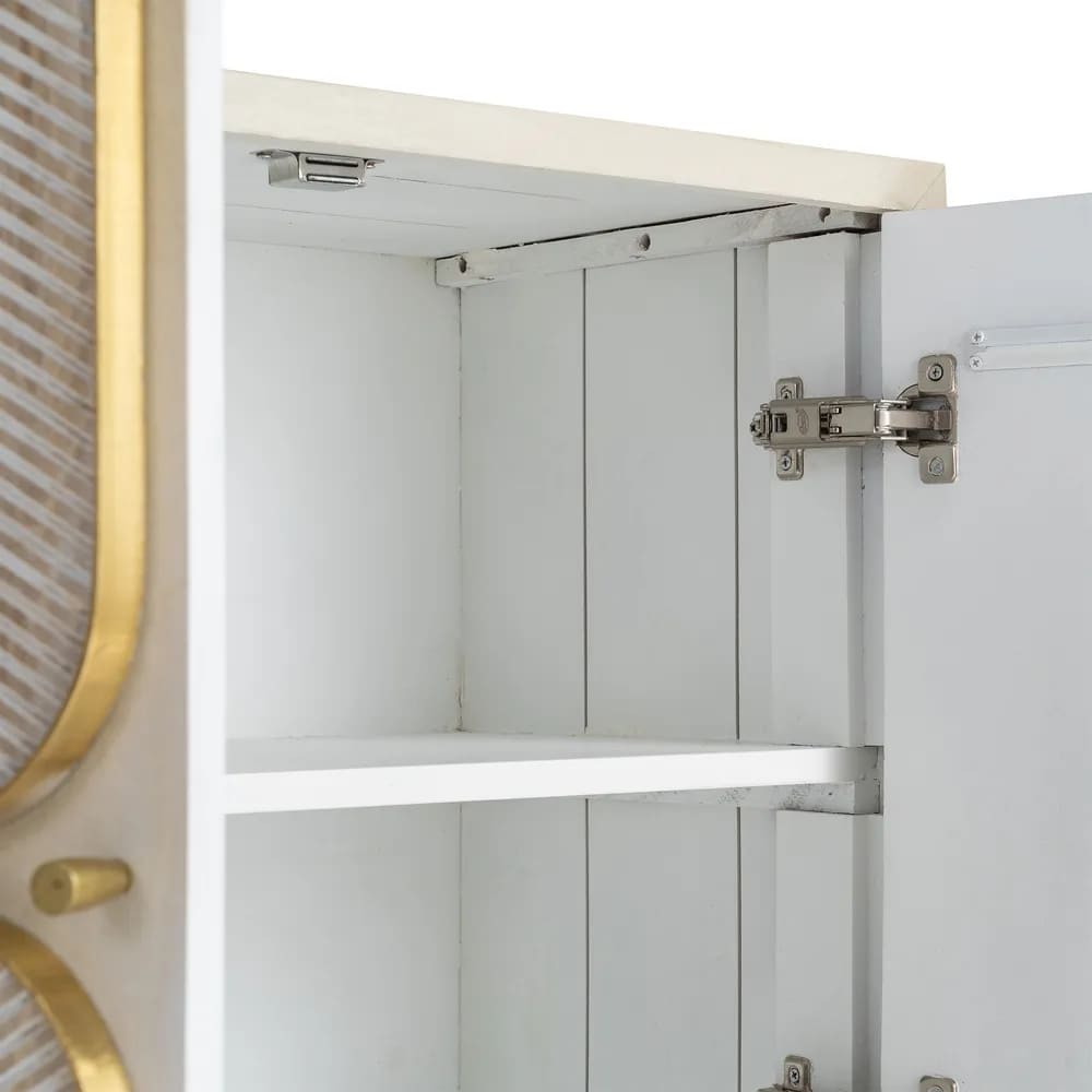 ALMACENAJE MASIVO E IMPECABLE: 🔑 Sus cuatro puertas ocultan un espacio interior con acabado blanco y baldas de gran capacidad, ofreciendo una solución de organización de élite tras una fachada de galería de arte.