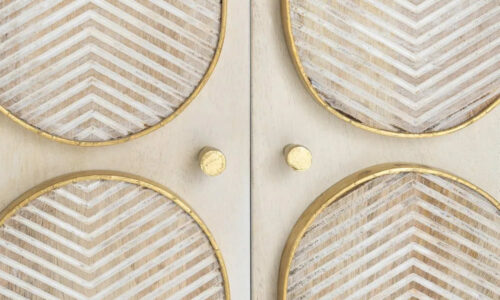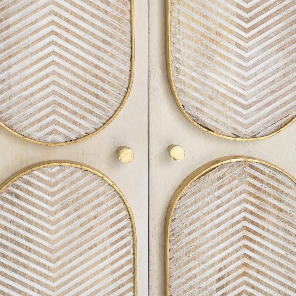 FRONTIS DE IMPACTO GEOMÉTRICO: 🎨 ¡MÁXIMA ELEGANCIA! Sus cuatro puertas presentan figuras talladas a mano con un exquisito perfilado metálico en dorado, creando un patrón visual rítmico y sofisticado de alta gama.