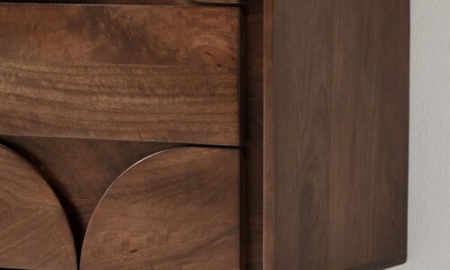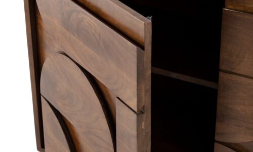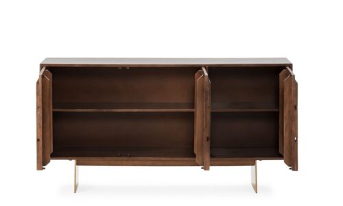 Haz que tu salón sea un espacio de revista con el Aparador “TRISHA”, una pieza única que combina artesanía y sofisticación. Su diseño con inserciones geométricas lo convierte en mucho más que un simple mueble: es un auténtico protagonista de la decoración.