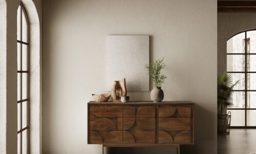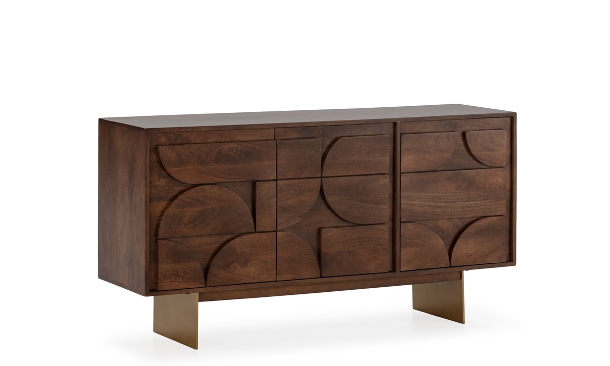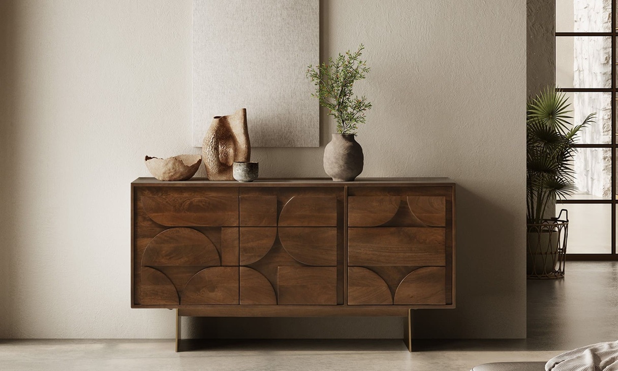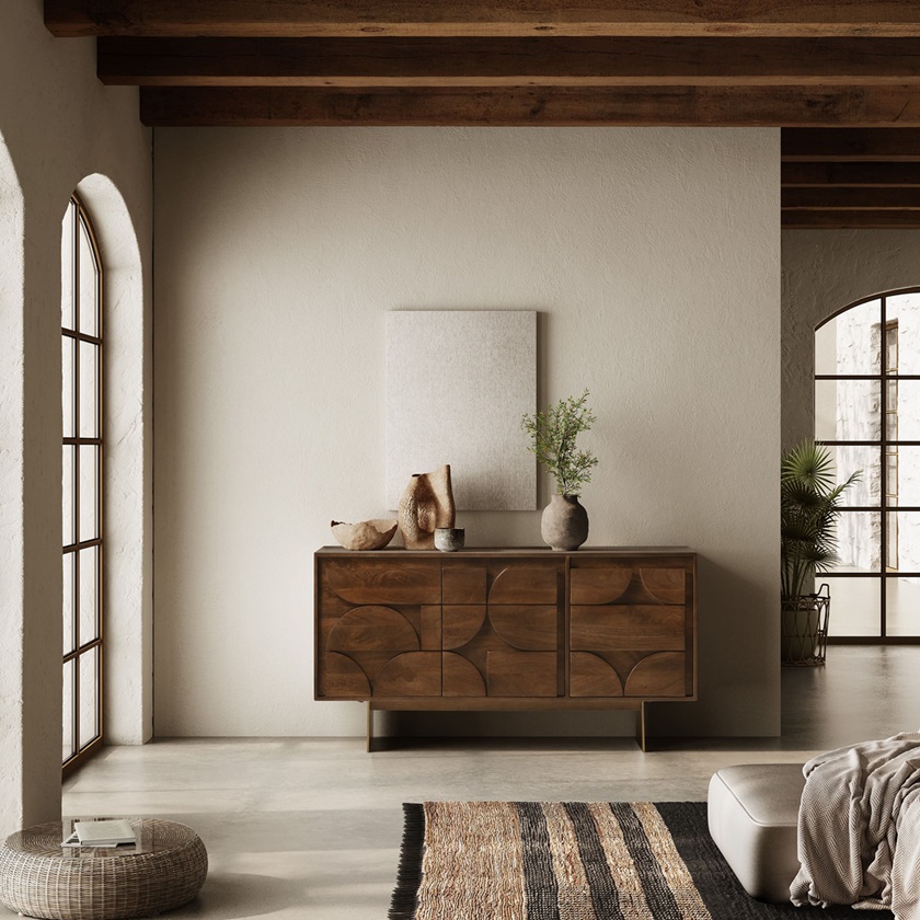 Haz que tu salón sea un espacio de revista con el Aparador “TRISHA”, una pieza única que combina artesanía y sofisticación. Su diseño con inserciones geométricas lo convierte en mucho más que un simple mueble: es un auténtico protagonista de la decoración.