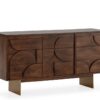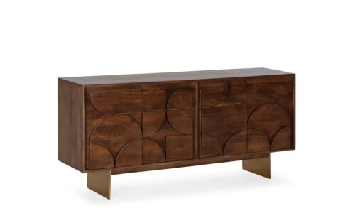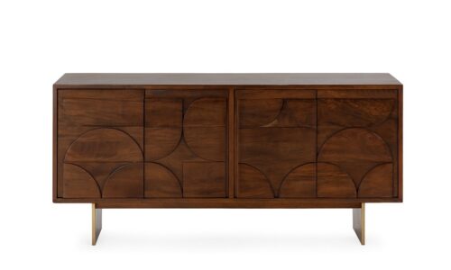 Haz que tu salón sea un espacio de revista con el Aparador “TRISHA”, una pieza única que combina artesanía y sofisticación. Su diseño con inserciones geométricas lo convierte en mucho más que un simple mueble: es un auténtico protagonista de la decoración.