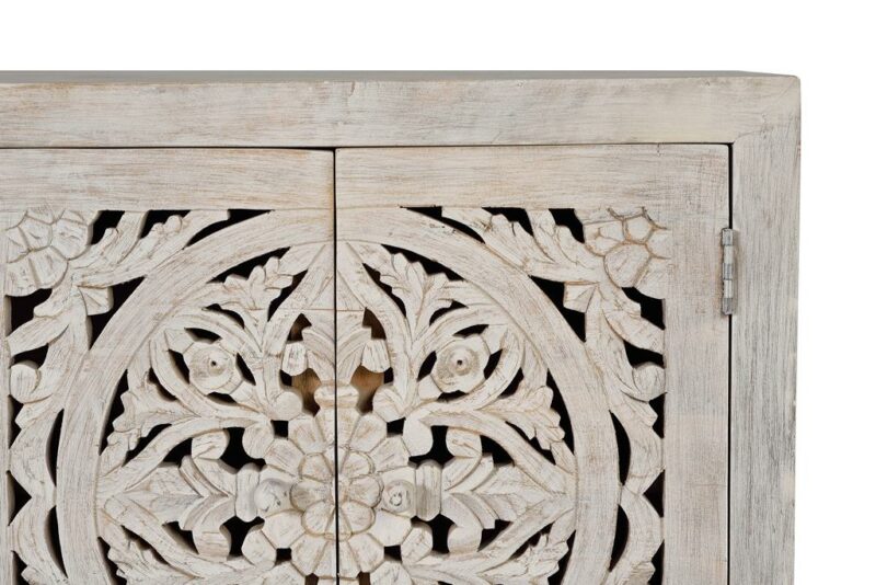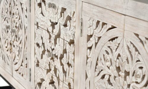 - CALADO Y TALLADO ARTESANAL EN EL FRONTAL: 🔪 ¡LA PECULIARIDAD INIGUALABLE! El frontal es una superficie continua de CALADOS Y TALLAS HECHAS A MANO. Este detalle artesanal aporta una textura y un dinamismo visual que convierte el mueble en una pieza central inconfundible.