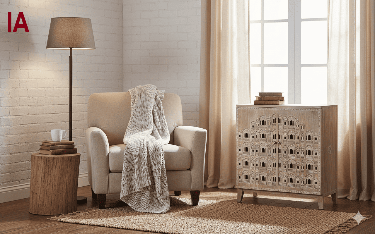 Este mueble auxiliar, fabricado en madera de mango, destaca por su diseño artesanal, está pintado en un tono natural que resalta las vetas únicas y las variaciones de color propias de la madera. En su parte frontal, dos puertas con impresionantes figuras de templo talladas a mano, reflejan un trabajo detallado y minucioso, con formas inspiradas en la arquitectura tradicional. Al abrir las puertas, el interior revela una balda que ofrece un espacio funcional para organizar y almacenar diversos objetos.