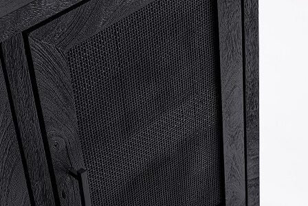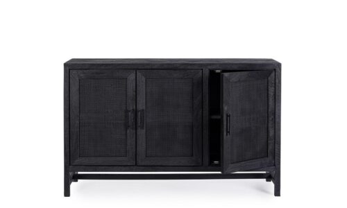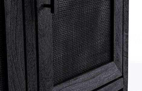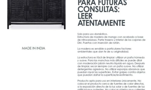 Cuenta con tres puertas con marcos de madera e inserciones de ratán tejido, que lo suman al estilo artesanal. El espacio de almacenaje es amplio, ideal para vajilla, textiles o elementos personales, ofreciendo orden con personalidad.