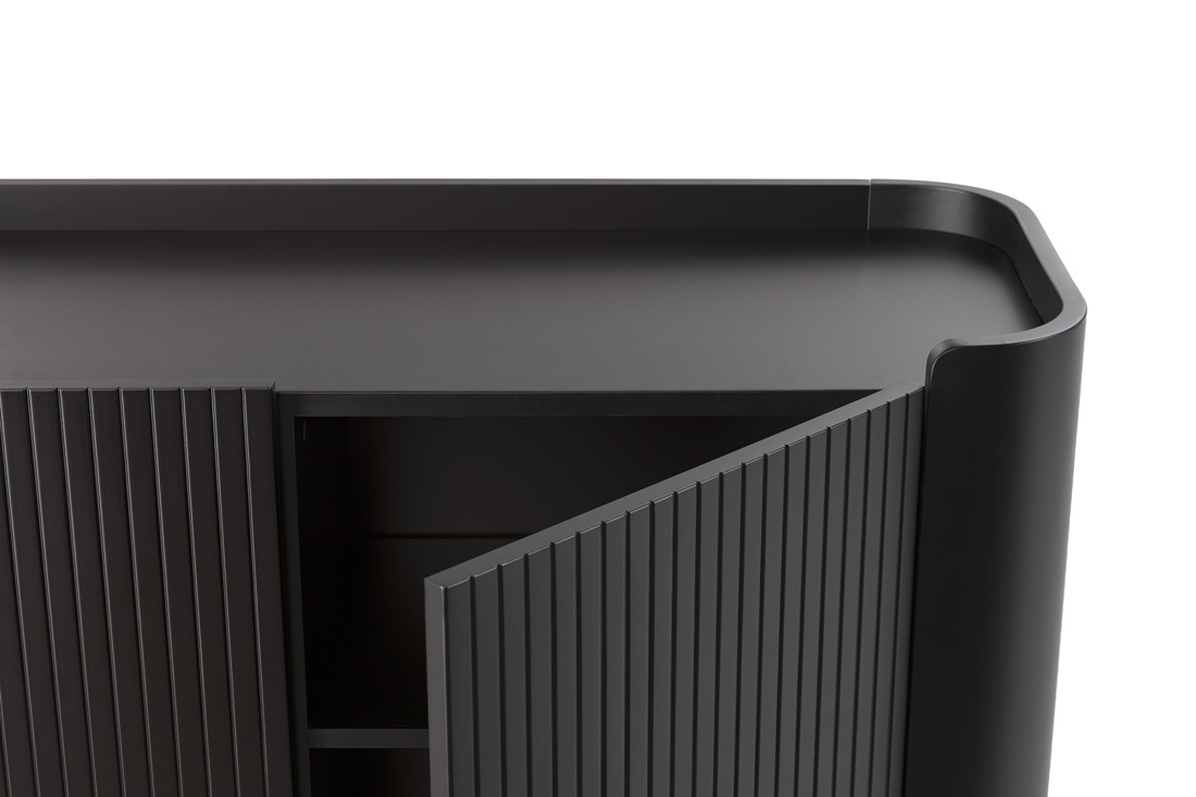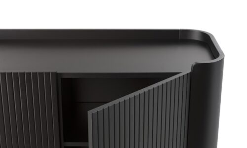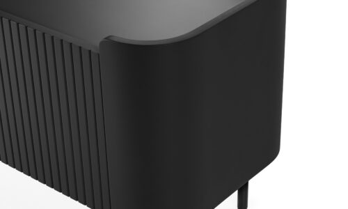 Fabricado con estructura de MDF lacado sobre tablero melamínico, garantiza resistencia y durabilidad. Sus pies metálicos acabados en negro elevan el diseño con un aire ligero y actual, mientras que los costados curvos delanteros, junto con la moldura trasera, sobresalen de la tapa aportando un detalle único de gran diseño.