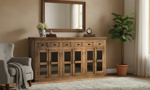 Aparador alto fabricado en madera de mango, con un diseño robusto que recupera la solidez y elegancia del diseño. Su tapa cuenta con delicadas molduras, mientras que el zócalo inferior refuerza su presencia imponente. Acabado en un color avellana, resalta la textura natural de la madera. En la parte superior, los cajones de almacenamiento ideales pueden usarse para organizar pequeños objetos. Debajo, seis puertas de cristal enmarcadas con madra permiten exhibir vajilla, libros y otros elementos decorativos. Un mueble perfecto para complementar el espacio con un carácter clásico y contemporáneo.