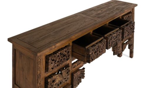 - 5 CAJONES TALLADOS: Dispuestos simétricamente en el frente. Perfectos para guardar llaves, correspondencia o secretos, con la garantía de que el frente tallado esconde su función.