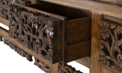 - TRABAJO ARTESANAL DE CALADO Y TALLADO A MANO: ¡ESTO NO ES UN MUEBLE, ES UNA ESCULTURA! Cada centímetro cuadrado es el resultado de horas de dedicación. Los elaborados calados y tallados a mano le confieren una textura y una profundidad visual ABSOLUTAMENTE ÚNICAS.