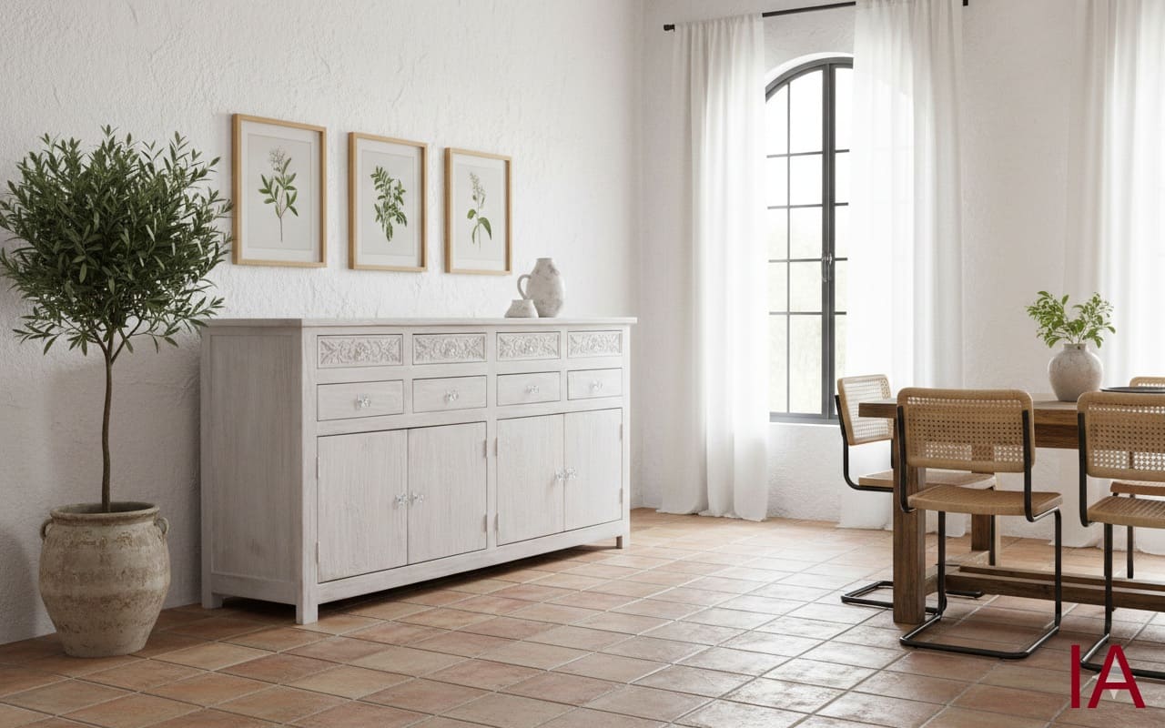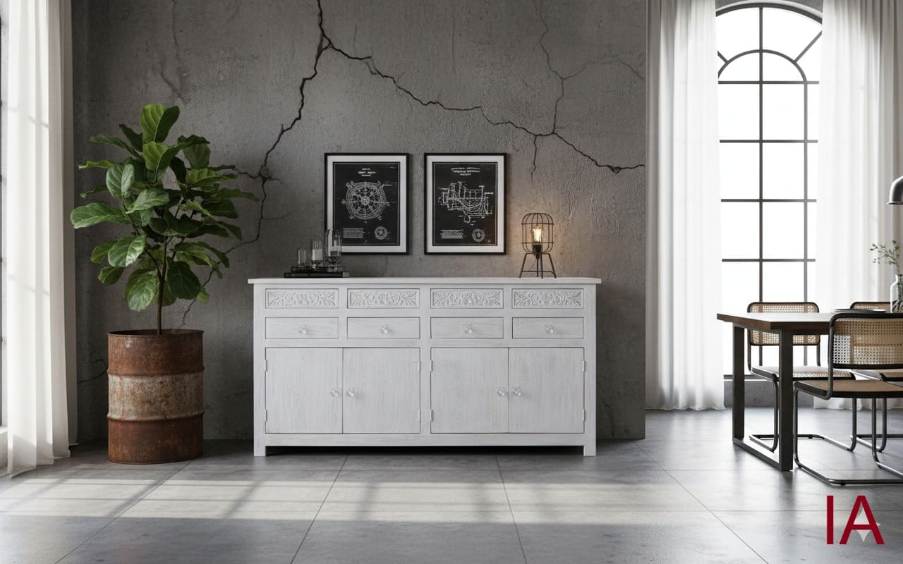APARADOR YLANG (200 CM): MADERA MACIZA DE MANGO, ACABADO BLANCO ENVEJECIDO Y TALLADO ARTESANAL DE ÉLITE. ¡LA PIEZA DE COLECCIONISTA QUE TU HOGAR EXIGE PARA DESTACAR! 🏛️✨🌟