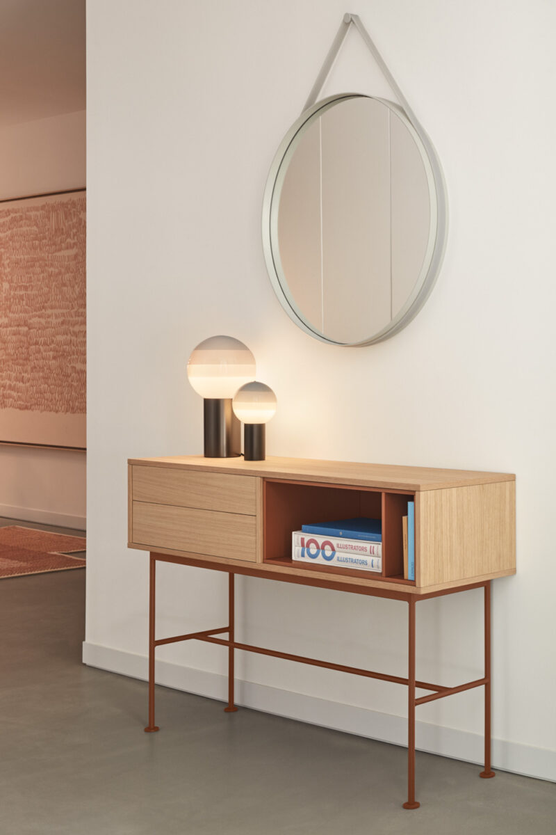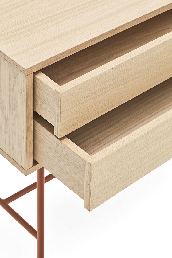 Esta consola YOKO dispone de 2 cajones de chapa de roble natural con apertura por pulsación «push to open» y guías metálicas ocultas, y un modulo expositor lacado en color teja al igual que la base metálica.